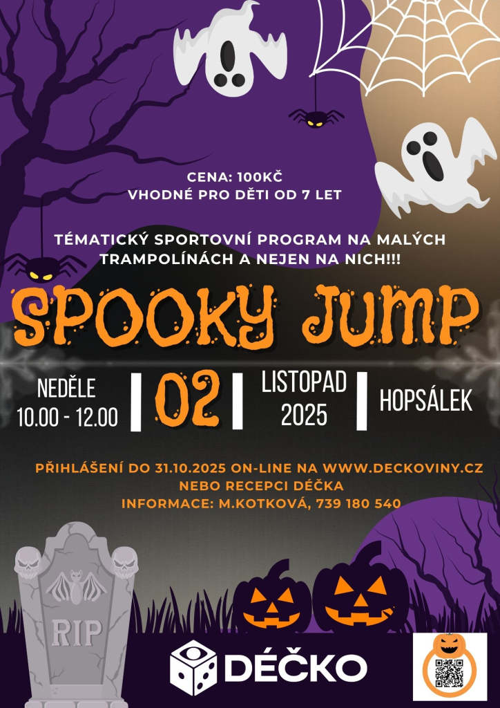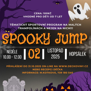 02.11.2025 Tématický sportovní program na malých trampolínách a nejen na nich. Přihlášení na recpci Déčka nebo on-line www.deckoviny.cz do 31. 10. 2025. Informace: M. Kotková, tel.: 739 180 540 email: kotko...