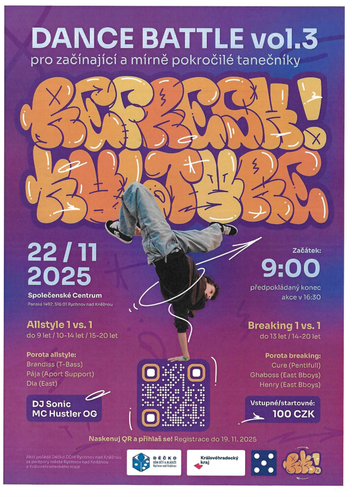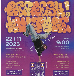 22.11.2025 Allstyle 1 vs. 1 - do 9 let/10-14 let/15-20 let Porota allstyle: Brandiss(T-Bass), Pája(Aport Support), Dia(East) Breaking 1 vs.1 - do 13 let/14-20 let Porota breaking: Cure(Pentifull), Ghabos...
