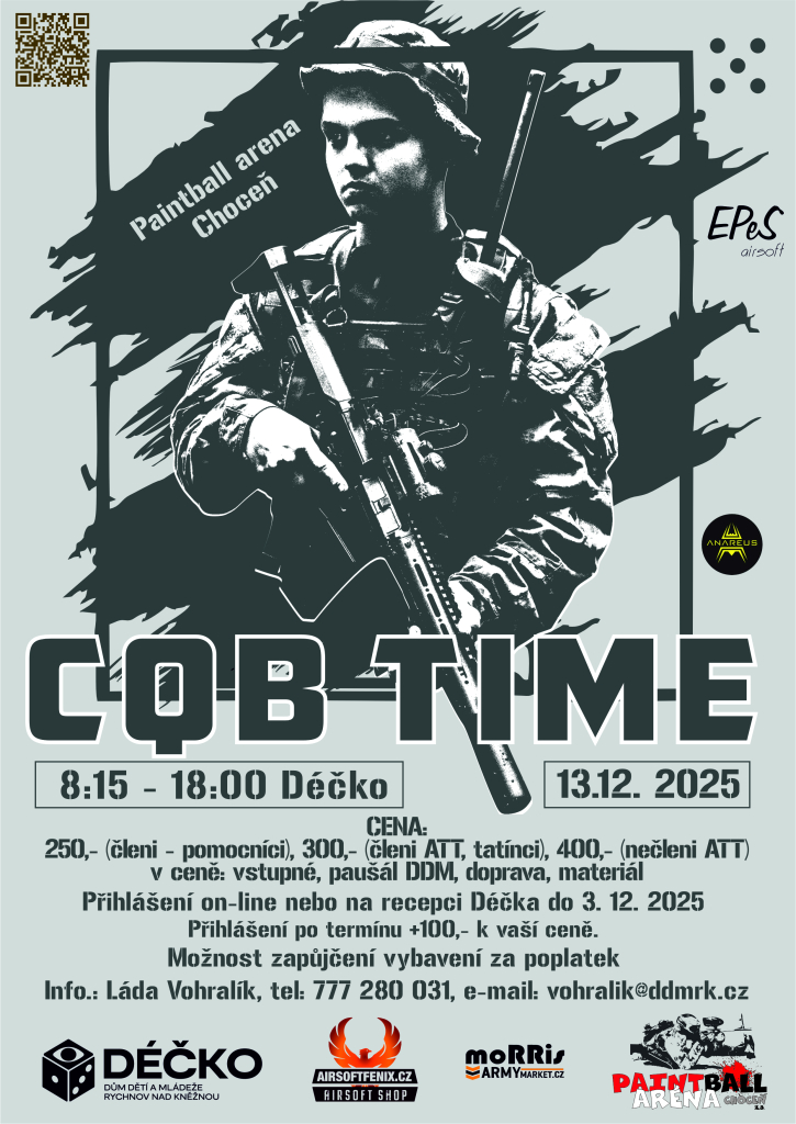 13.12.2025 Paintball aréna Choceň Členi + pomocníci 250,- Členi ATT + tatínci 300,- Nečleni ATT 400,- V ceně: vstupné, paušál DDM, doprava, materiál Přihlášení on-line nebo na recepci Déčka do 3. 12. 202...