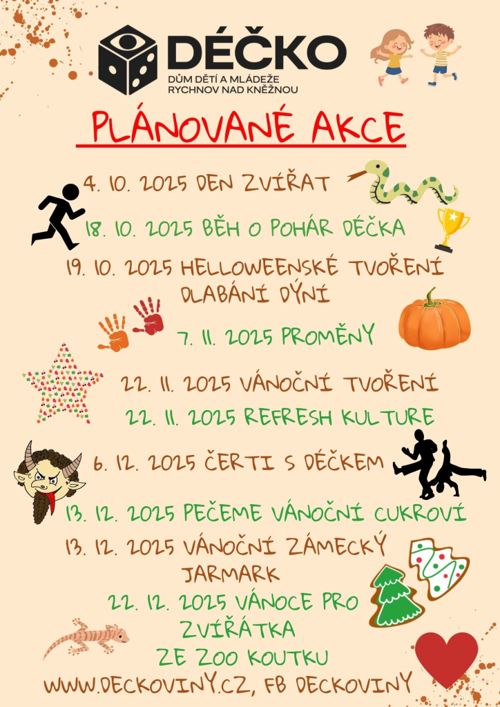 30.04.2025 V Déčku jsme si duben užili naplno! Každý týden se u nás něco dělo – tančilo se, tvořilo, peklo, soutěžilo… zkrátka nuda neměla šanci. Hned zkraje měsíce k nám zavítaly děti z MŠ Klíček – vyzkoušely si keramiku a užily si pohybové aktivity s netradičními pomůckami. Velký úspěch zaznamenala taneční soutěž Rychnovský taneček, která do Pelclova divadla přilákala nadšené malé tanečníky. Nechybělo j...