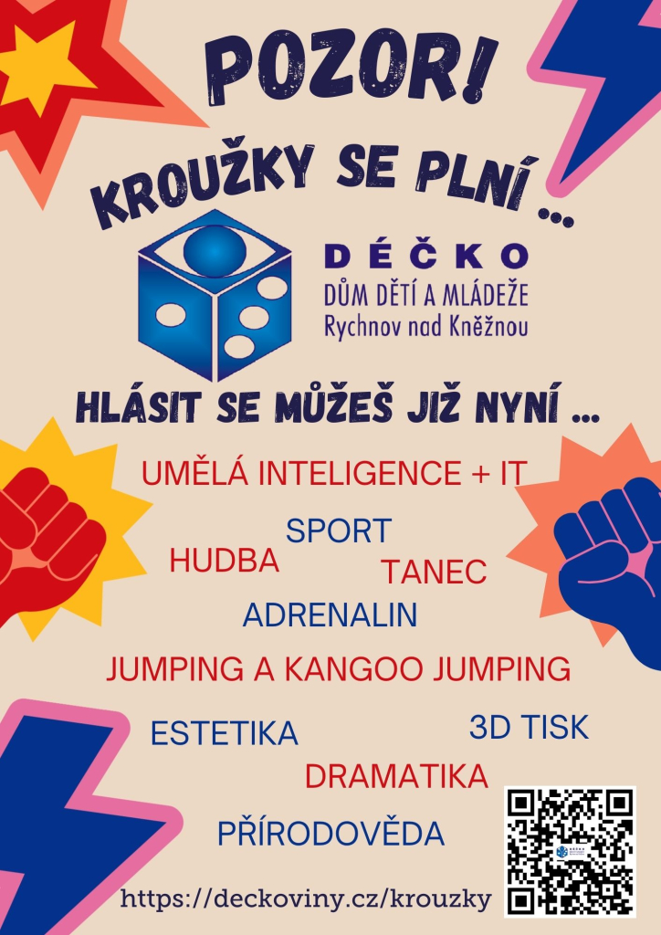 17.11.2024 Déčko má novou paní ředitelku … a nejen jí! Od 1.8.2024 do funkce ředitelky DDM nastoupila paní Bc. Miluše Barvířová. Již za jejího vedení a za podpory zřizovatele města Rychnova nad Kněžnou se stihly vybudovat nové multifunkční místnosti, které jsou nápomocny pro mnoho kroužků, obnovou prošel také zoo koutek, kde na mladé chovatele čekal nejen nový prostor, ale i noví obyvatelé (např. papoušek...