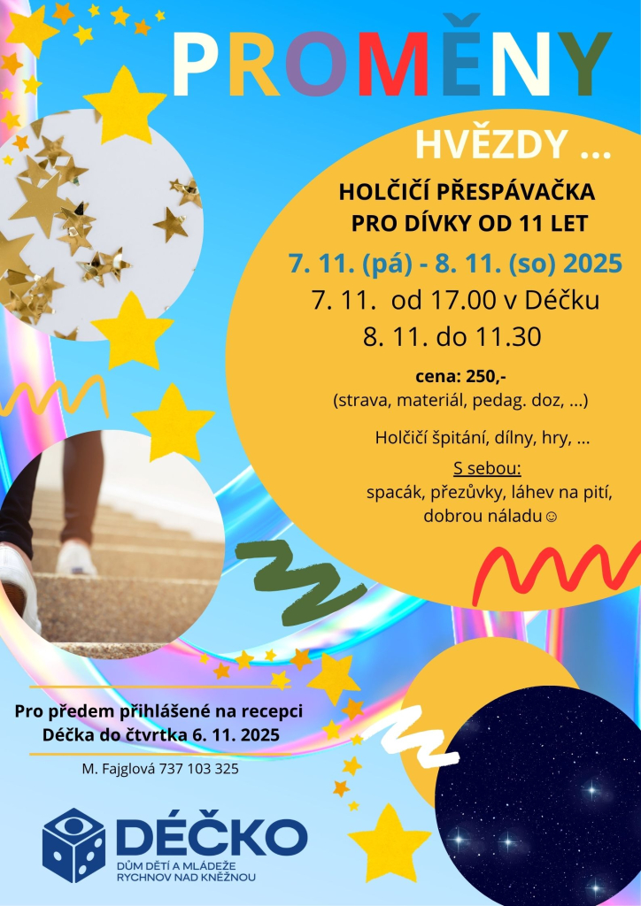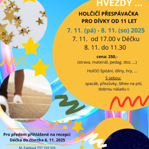 07.11.2025 Holčičí přespávačka pro dívky od 11 let. Holčičí špitání, dílny, hry, ... S sebou: spacák, přezůvky, láhev na pití a dobrou náladu :) Pro předem přihlášené na recepci Déčka do čtvrtka 6. 11. 202...
