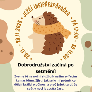 28.11.2025 Dobrodružství začíná po setmění! Zveme tě na noční službu k našim zvířecím kamarádům. Zjisti, jak se krmí potmě, co dělají králíci o půlnoci a proč ježek tvdí, že spát v noci je ztráta času. Pro ...