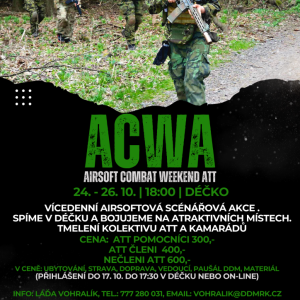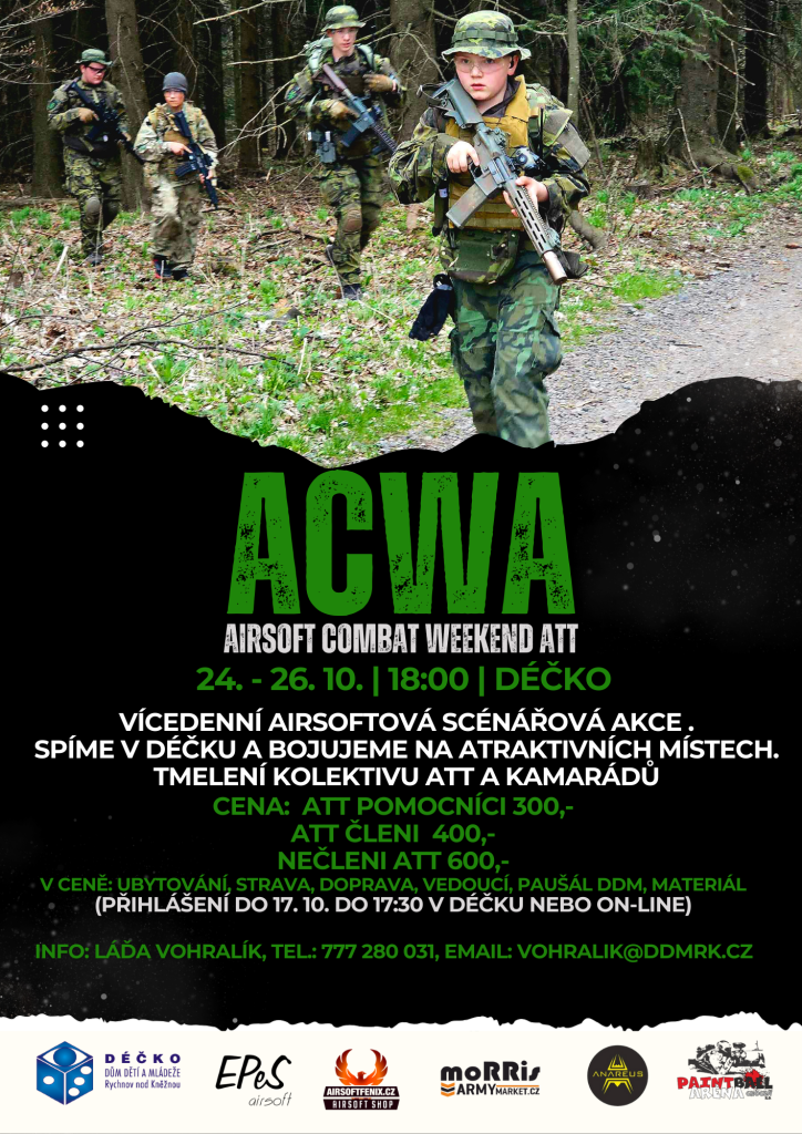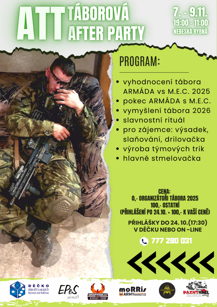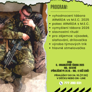 24.10.2025 Vícedenní airsoftová scénářová akce. Spíme v Déčku a bojujeme na atraktivních místech. Tmelení kolektivu ATT a kamarádů. V ceně: ubytování, strava, doprava, vedoucí, paušál DDM, materiál Přihláše...