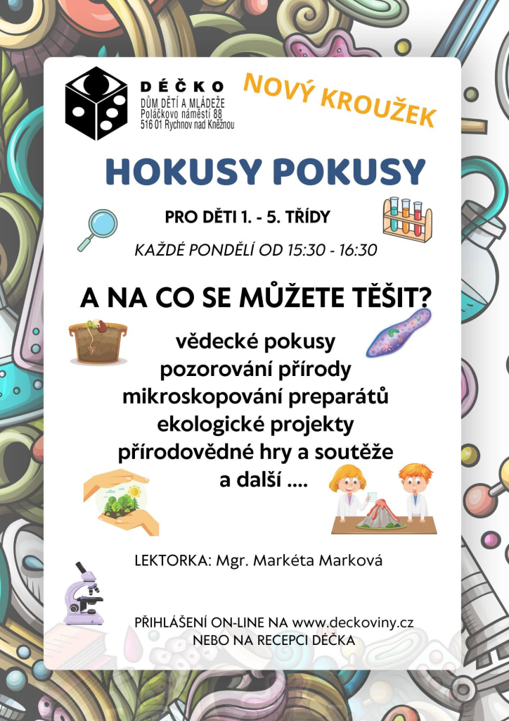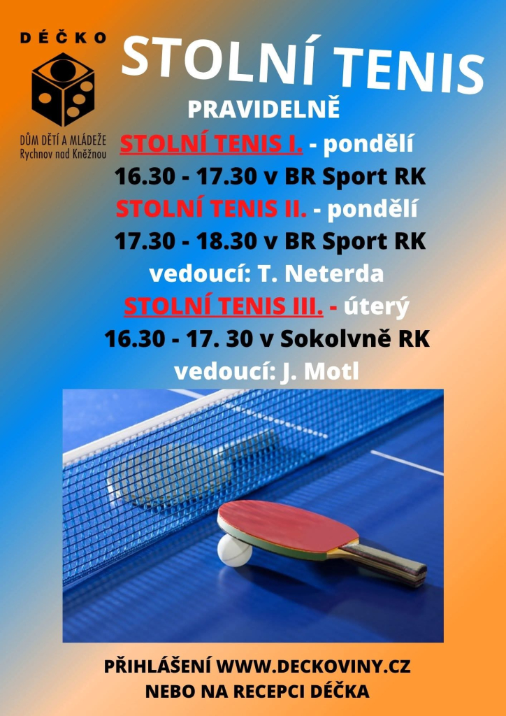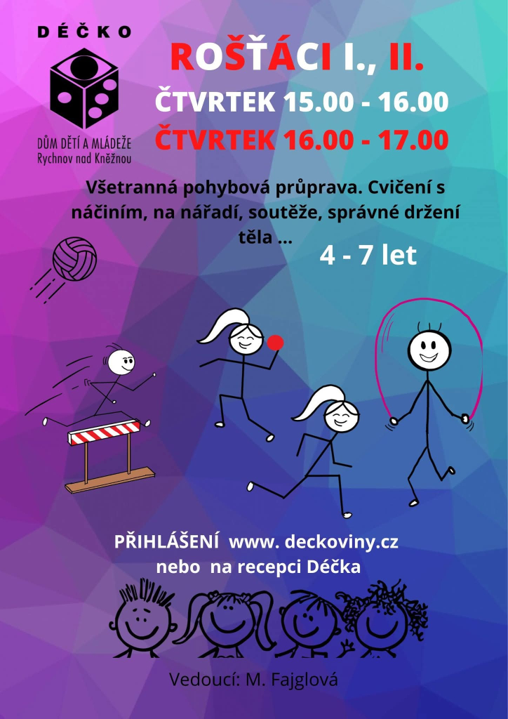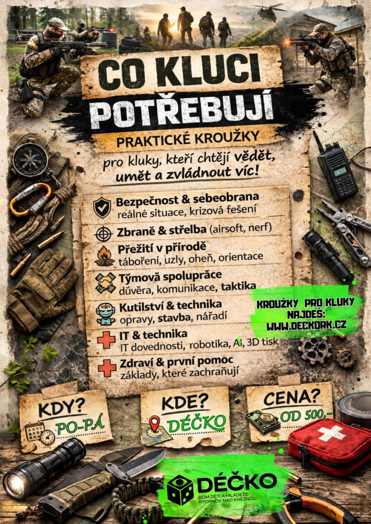 Přidej se k nám, máme ještě volná místa na kroužcích sportovních, technických, adrenalinových, výtvarných i dalších…. Vyber si zde: https://www.deckoviny.cz/krouzky