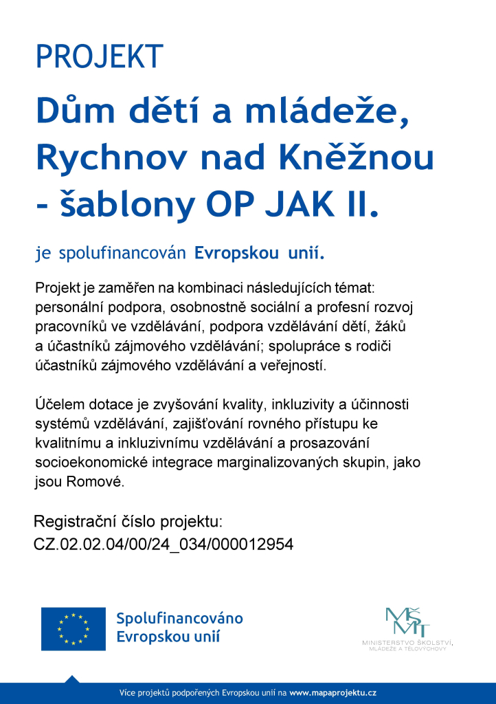 - Název projektu: Dům dětí a mládeže, Rychnov nad Kněžnou - šablony OP JAK II.